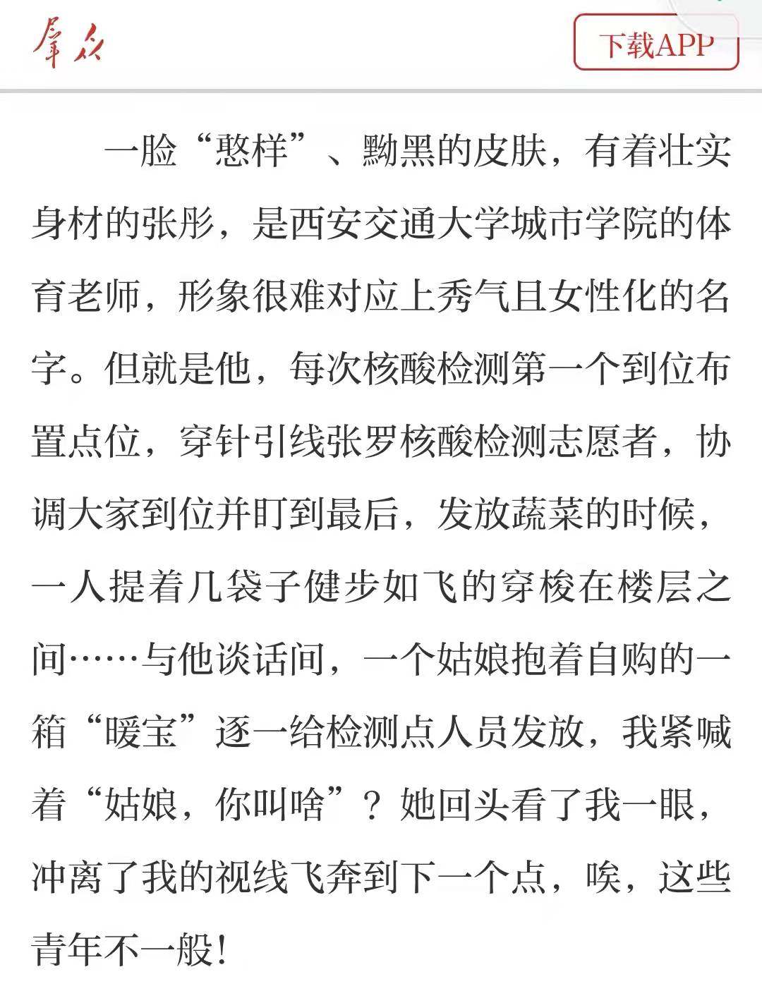 1月6日,群众新闻以《从来没有人如此,能打动我的心——贾村社区防疫志愿者素描》为题报道了包括学院体育部教师张彤在内的社区防疫志愿者的事迹。