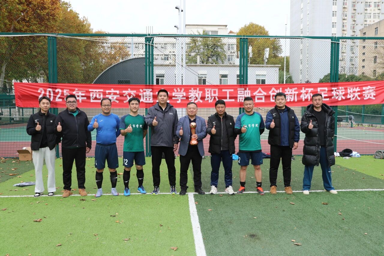为丰富教职工的业余文化生活,促进教职工之间的交流与增进彼此友谊,营造积极向上、顽强拼搏的精神氛围,10月至11月,学校工会组织教职工参加了2025年度西安交通大学“融合创新杯”教职工足球联赛比赛。队员们经过一个多月的激烈角逐,利用每周周末的休息时间在赛场上奋力拼搏,最终荣获了本次比赛甲组季军的优异成绩。